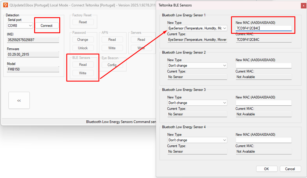 Deverá ser escolhida uma configuração que tenha BlueTooth activado (ie: 20240205=FMB150_OPTIMUS_1min_BT-EYE_buzzer_CD_CAN_r02)