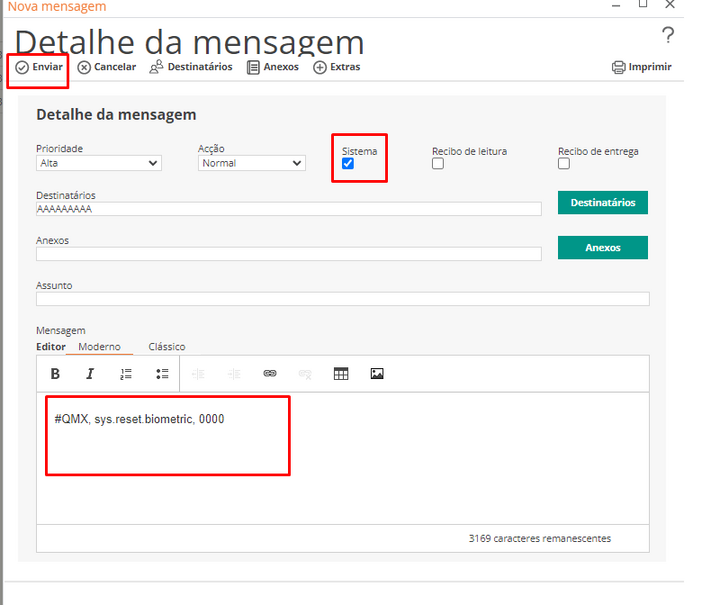 Após escolher os destinatários é necessário activar a opção de mensagem de sistema.